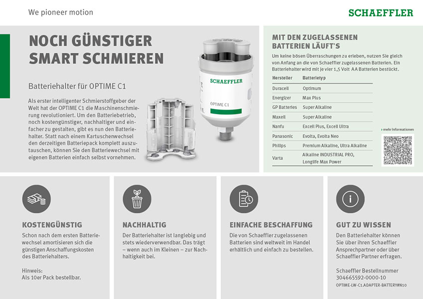 Um den Batteriebetrieb, noch kostengünstiger, nachhaltiger und einfacher zu gestalten, gibt es nun den Batteriehalter. Statt nach einem Kartuschenwechsel den derzeitigen Batteriepack komplett auszutauschen, können Sie den Batteriewechsel mit eigenen Batterien einfach selbst vornehmen.