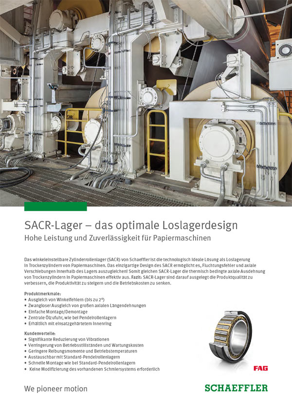 Das winkeleinstellbare Zylinderrollenlager (SACR) von Schaeffler ist die technologisch ideale Lösung als Loslagerung in Trockenzylindern von Papiermaschinen. Das einzigartige Design des SACR ermöglicht es, Fluchtungsfehler und axiale Verschiebungen innerhalb des Lagers auszugleichen! Somit gleichen SACR-Lager die thermisch bedingte axiale Ausdehnung von Trockenzylindern in Papiermaschinen effektiv aus. Fazit: SACR-Lager sind darauf ausgelegt die Produktqualität zu verbessern, die Produktivität zu steigern und die Betriebskosten zu senken.
