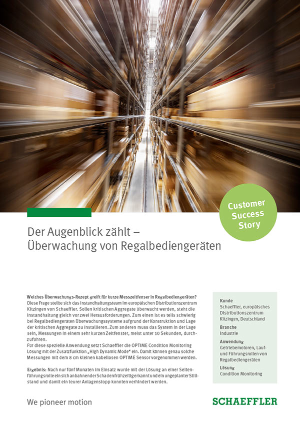 Welches Überwachungs-Rezept greift für kurze Messzeitfenser in Regalbediengeräten? Diese Frage stellte sich das Instandhaltungsteam im europäischen Distributionszentrum Kitzingen von Schaeffler. Es gelang mit der Zusatzfunktion „High Dynamic Mode“ in der OPTIME Condition Monitoring Lösung.